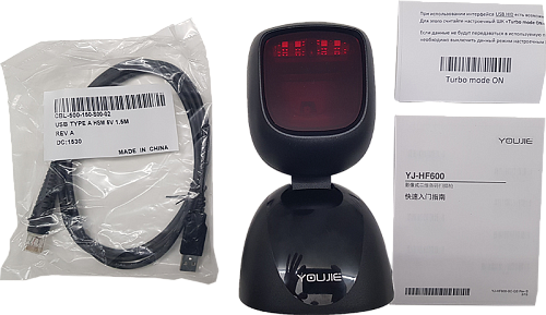 Стационарный сканер Youjie YJ HF600-1-1USB с возможностью считывания 1D и 2D штрих-кодов и подключением через USB-разъем. Может работать с системой ЕГАИС.
